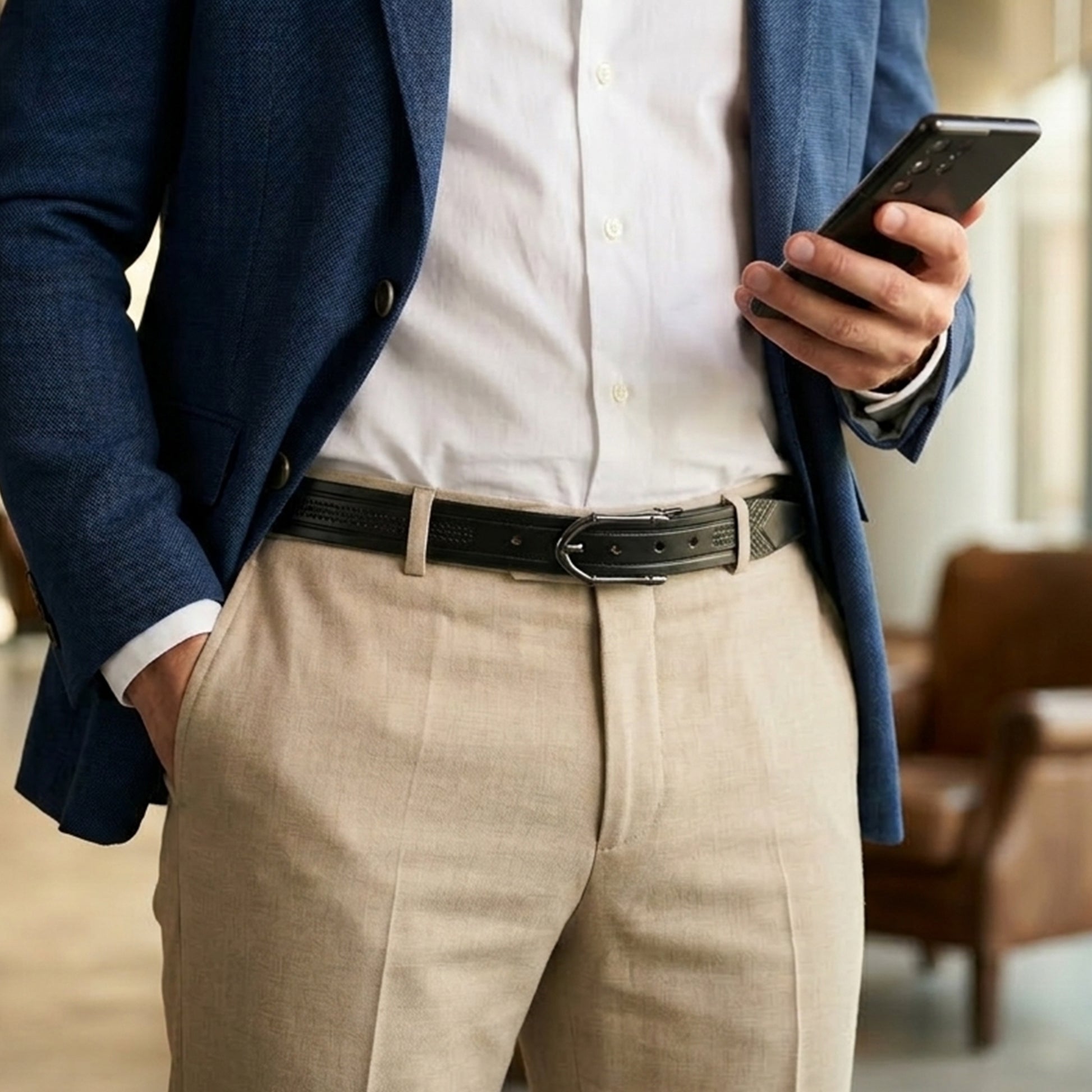 The standout feature is its sleek black-silver buckle, designed to add a subtle yet striking contrast. Whether you're dressing up for a formal occasion or adding polish to a casual outfit, this belt blends seamlessly with any wardrobe.